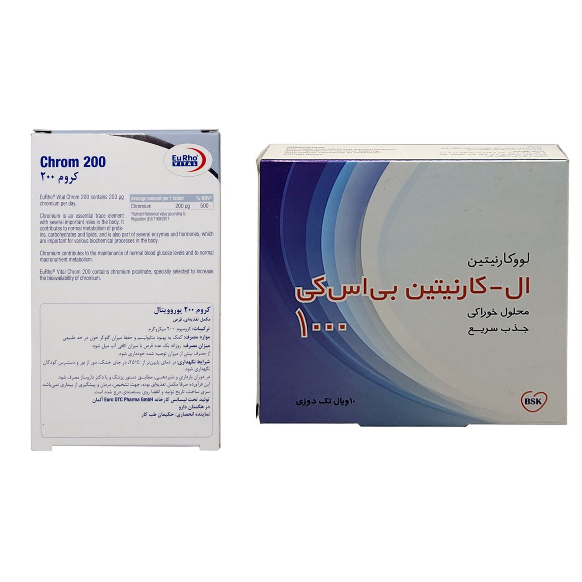 قرص کروم 200 میکروگرمی یورو ویتال بسته 60 عددی به همراه ویال خوراکی ال کارنیتین 1000 میلی گرمی بی اس کی بسته 10 عددی